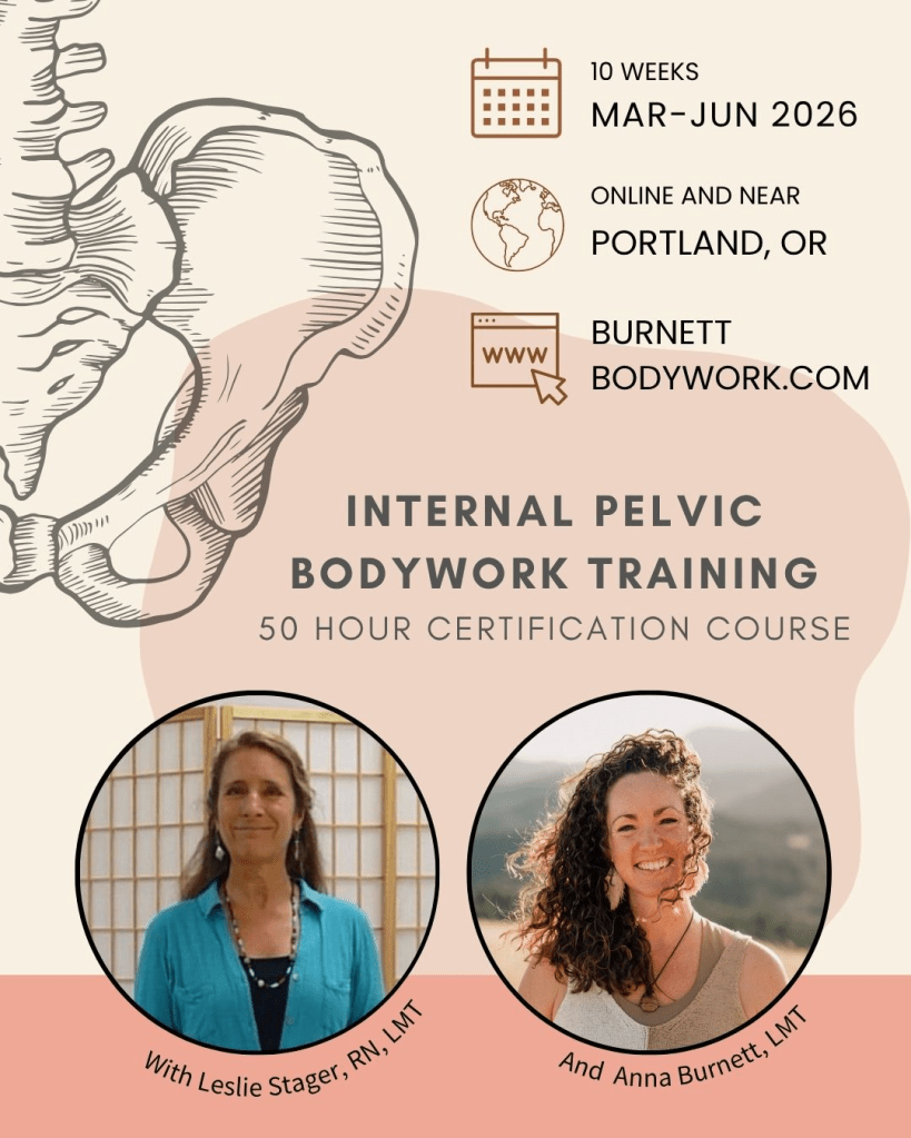 Entering the Temple is a 50 hour professional internal pelvic bodywork certification course taught by Leslie Stager and Anna Burnett. Details and registration here.