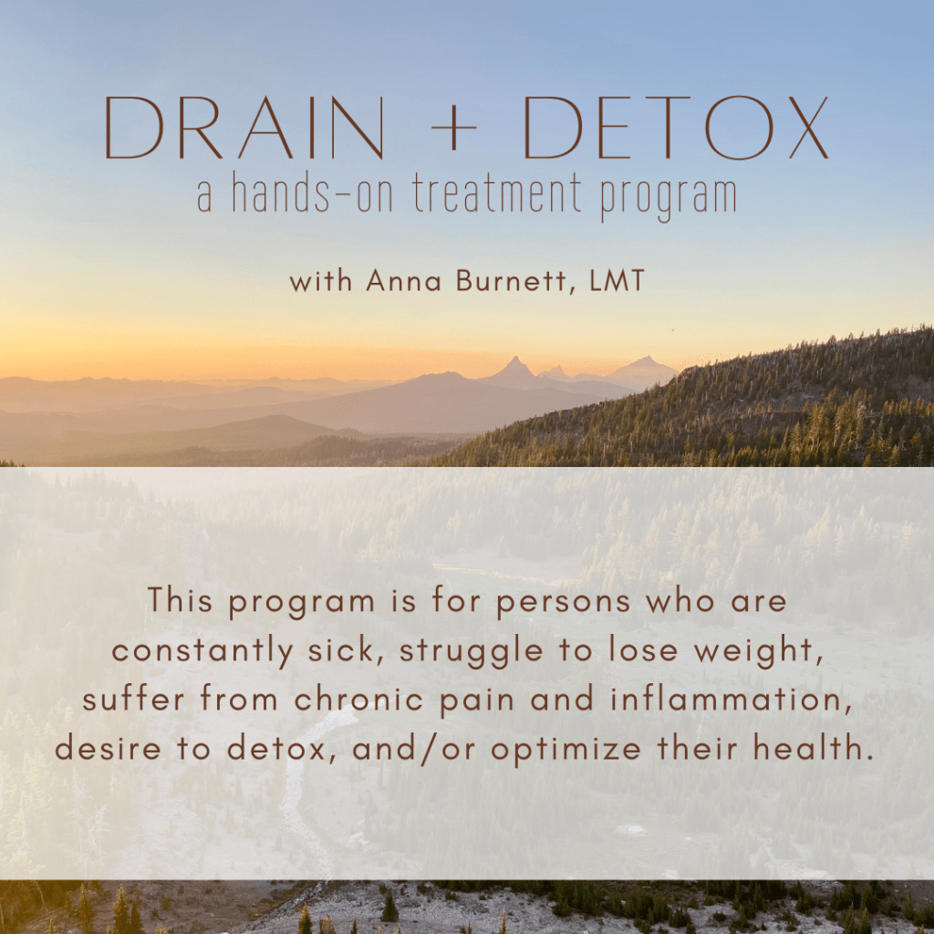 We will systematically work through the “lymph wheel,” which is a manual therapy approach to lymphatic drainage and wellness developed by Dr. Perry Nickelston of Stop Chasing Pain. Your treatment protocol will be based on your individual circumstances and detox reactions. Anna will guide you through this process for one month.