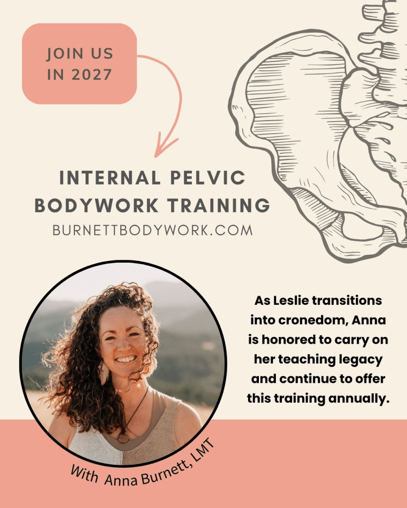 Note: this class is currently formatted for a female-only learning environment. In the future, Anna does plan to offer all-genders internal pelvic bodywork training for practitioners of all genders.